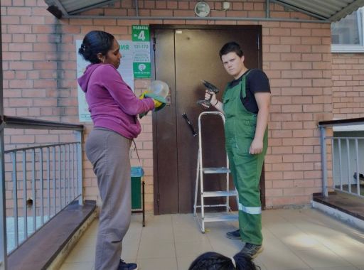 Сотрудники тщательно очистили плафоны входной группы от грязи, превратив рутину в пример слаженной работы.