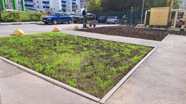 На Васильевской, 7 провели посев газона — совсем скоро здесь зазеленеет свежая трава и будет по-настоящему уютно